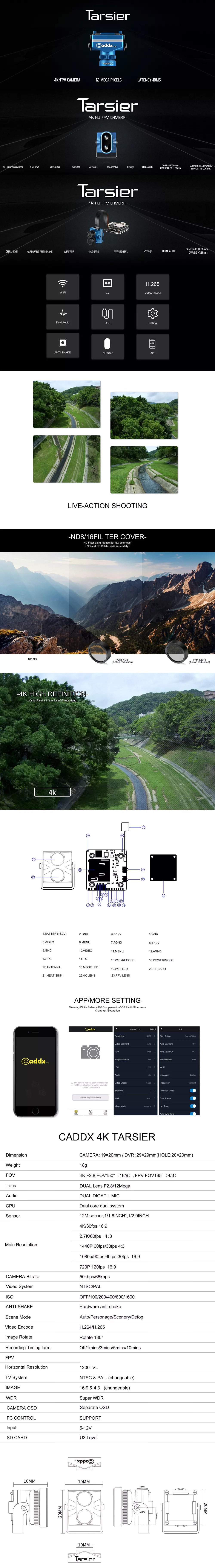 The Tarsier features WiFi capability to enable viewing your live image on your smartphone via the Caddx app. This app also allows the user to change camera parameters wirelessly as well!