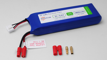 LiFePO4 Receiver Power Pack, with high-rate 3.5mm gold charge/discharge plugs, and Hyperion-style Balance Tap.