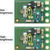 The low-brightness and high-brightness versions of this sensor look almost identical, but there are several ways to tell them apart. One is to look at resistors R3 and R4 on the emitter side of the sensor: