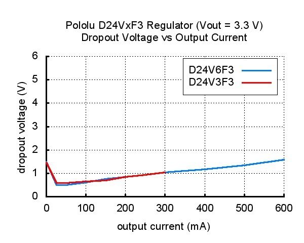 | Typical dropout voltage of Pololu step-down voltage regulator D24VxF3. |