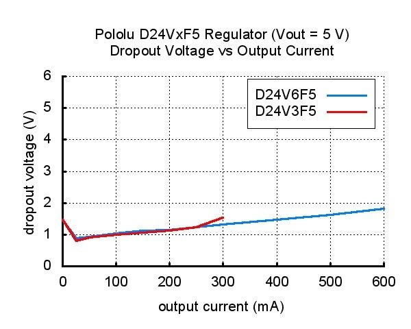 | Typical dropout voltage of Pololu step-down voltage regulator D24VxF5. |