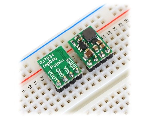 | Pololu step-down voltage regulator D36V6Fx/D24V6Fx/D24V3Fx in a breadboard. |