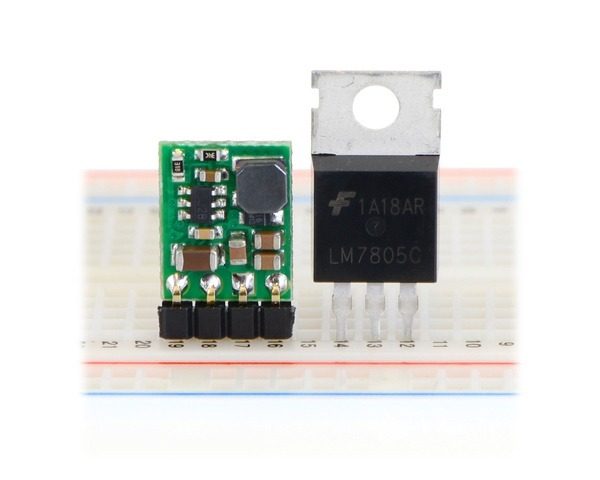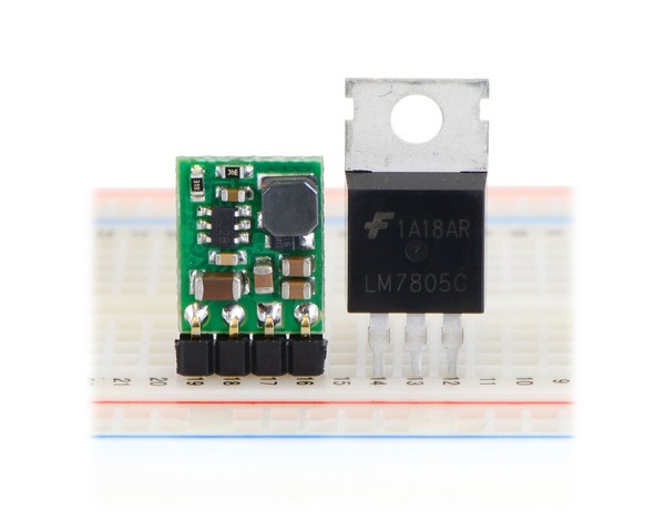 | Pololu step-down voltage regulator D36V6Fx/D24V6Fx/D24V3Fx next to a 7805 voltage regulator in TO-220 package. |