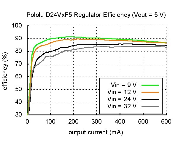 | Typical efficiency of Pololu step-down voltage regulator D24VxF5. |