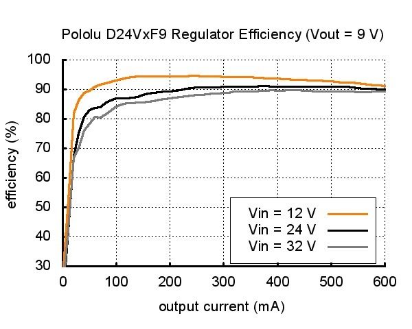 | Typical efficiency of Pololu step-down voltage regulator D24VxF9. |