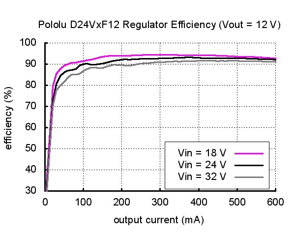 | Typical efficiency of Pololu step-down voltage regulator D24VxF12. |