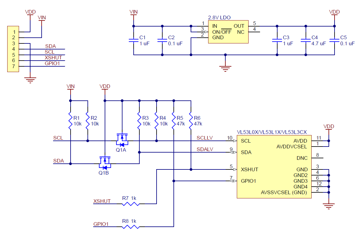 - Schematic diagram of the VL53L0X/VL53L1X/VL53L3CX Time-of-Flight Distance Sensor Carrier (108k pdf)