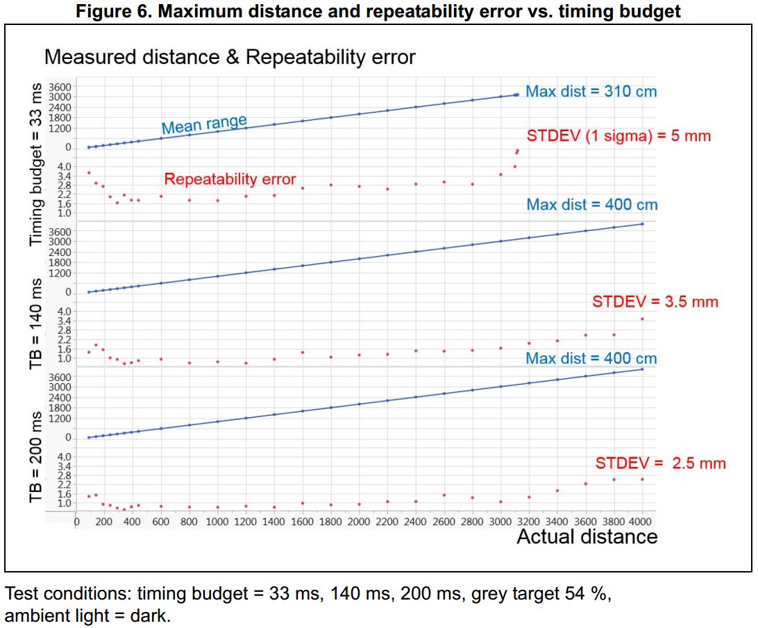 The VL53L1X offers three distance modes: short, medium, and long. Long distance mode allows the longest possible ranging distance of 4 m, but the maximum range is significantly affected by ambient light. Short distance mode is mostly immune to ambient light, but the maximum ranging distance is typically limited to 1.3 m (4.4 ft). The maximum sampling rate in short distance mode is 50 Hz while the maximum sampling rate for medium and long distance modes is 30 Hz. Performance can be improved in all modes by using lower sampling rates and longer timing budgets (as can be seen in the figure above).
