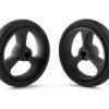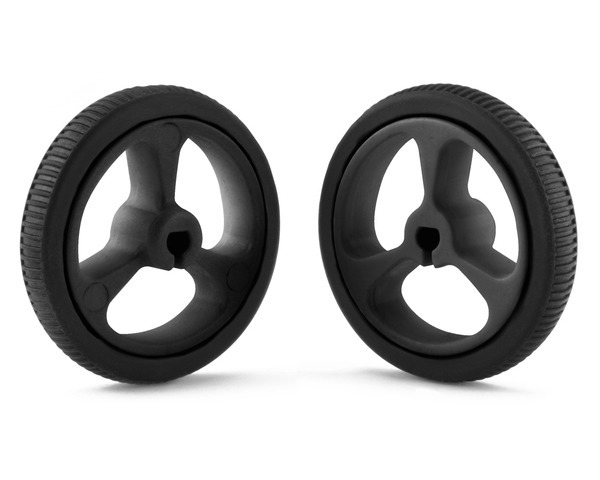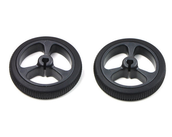 These black plastic wheels have silicone tires and measure 32 mm (1.26″) in diameter, and they press-fit onto the 3mm D shafts on many of our motors, including our micro metal gearmotors and our mini plastic gearmotors. This product is a pair of wheels.