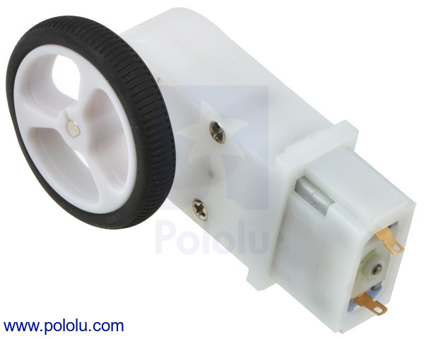 | Mini Plastic Gearmotor, 90° 3mm D-Shaft Output with Pololu Wheel 32×7mm. |