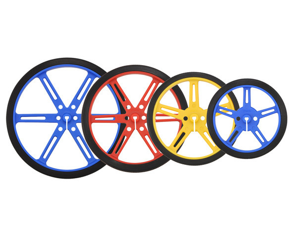 | Pololu Wheels with 90, 80, 70, and 60 mm diameters in three colors: blue, red, and yellow. |