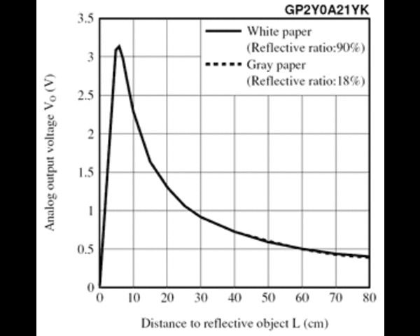| Sharp GP2Y0A21YK distance sensor distance-to-voltage graph. |